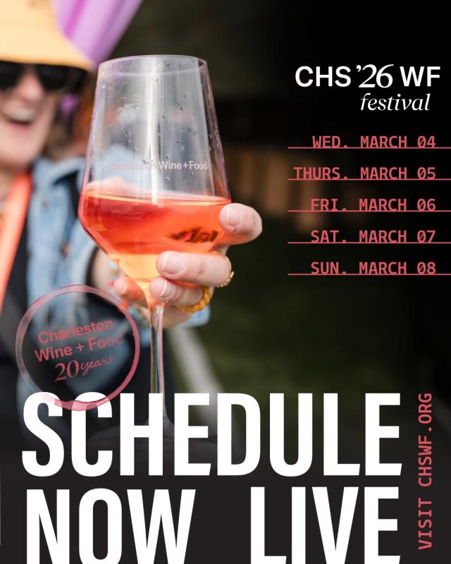 <span itemprop="addressLocality">Charleston</span>, <span itemprop="addressRegion">Charleston County</span>4 March 2026 - 8 March 2026Type: ActivityCharleston Wine + Food was founded in 2005 by a group of loyal community leaders with a vision of creating an event to promote + elevate Charleston’s culinary brand.