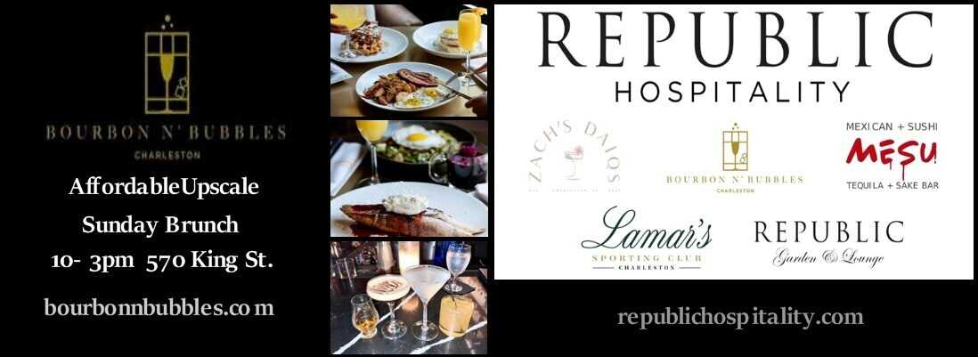 Bourbon N' Bubbles bill themselves as the ideal oasis for hosting your holiday and bachelorette parties, company socials, or your next team building event. If you're seeking a venue for a gathering that provides world-class service, B&B will not disappoint. To book visit https://charleston-events.com/ To take part in one of Charleston's most stylish dining experiences visit https://bourbonnbubbles.com/