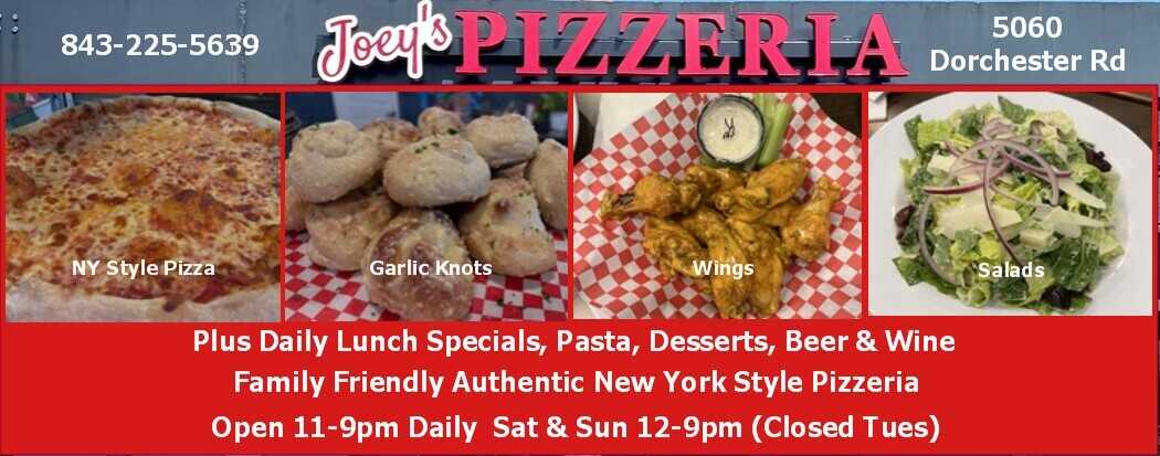 Joey's offers lunch combos 11-1pm that include slices, host happy hour 4-6pm weekdays, and provide trivia every Monday night. You can order online, call in your order, and pick it up on the way home. Want to know more about Joey's Pizzeria, than check them out at https://joeyspizzasc.com/